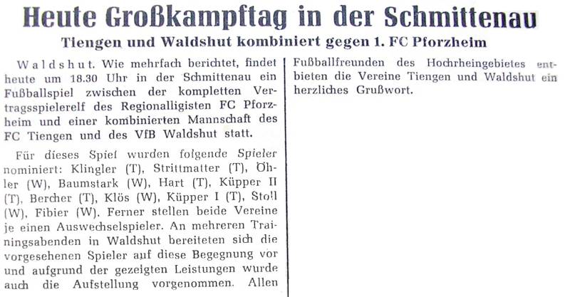 FC Tiengen/VfB Waldshut - 1.FC Pforzheim Verfasst von BC. Veröffentlicht in Aktiv 1. Mannschaft 22.06.1964: FC Tiengen/VfB Waldshut -Mit einer gemeinsamen Mannschaft gegen den 1.FC Pforzheim Drucken E-Mail Zurück Weiter