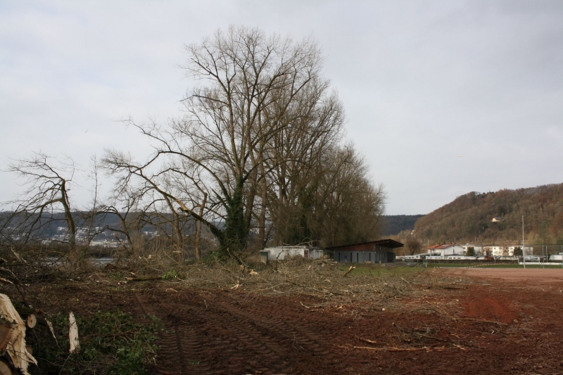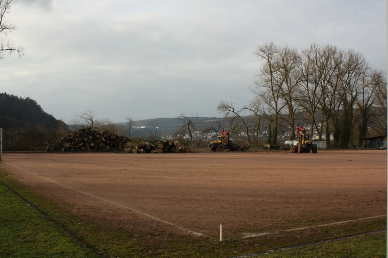 Die erste Fällaktion der Pappeln begann oberhalb des Areals des Hundesportvereins. Dort wurden heute auch noch die gefällten Pappeln verarbeitet, wobei der Maschinenring mit schwerem Gerät beim Verarbeiten zu Hackschnitzeln ganze Arbeit leistet. Heute ging es nun auf dem Rheinuferweg neben dem VfB-Areal weiter. Am Nachmittag gab es bereits beim Hartplatz eine deutlich sichtbare Schneise Richtung Rhein.