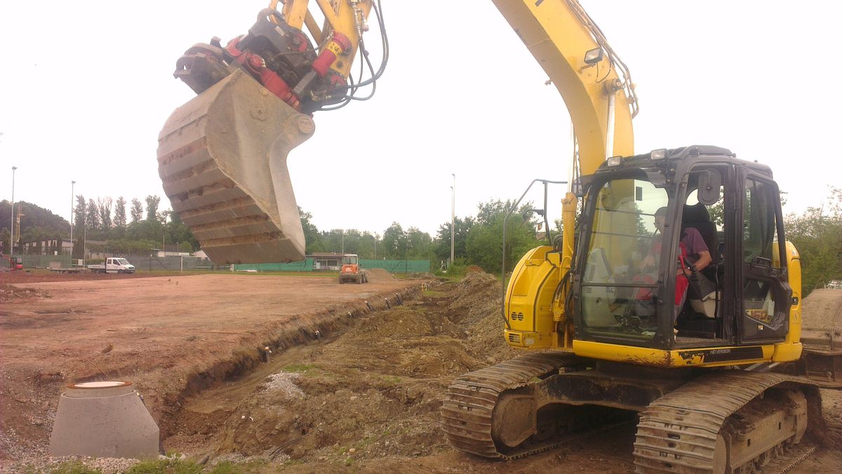 Auf der Baustelle zum neuen VfB-Kunstarasenplatz bewegt sich einiges. Die Oberfläche des vorhandenen Hartplatzes wird aufgerauht und danach Füllmaterial für die Tragschicht aufgeschüttet.