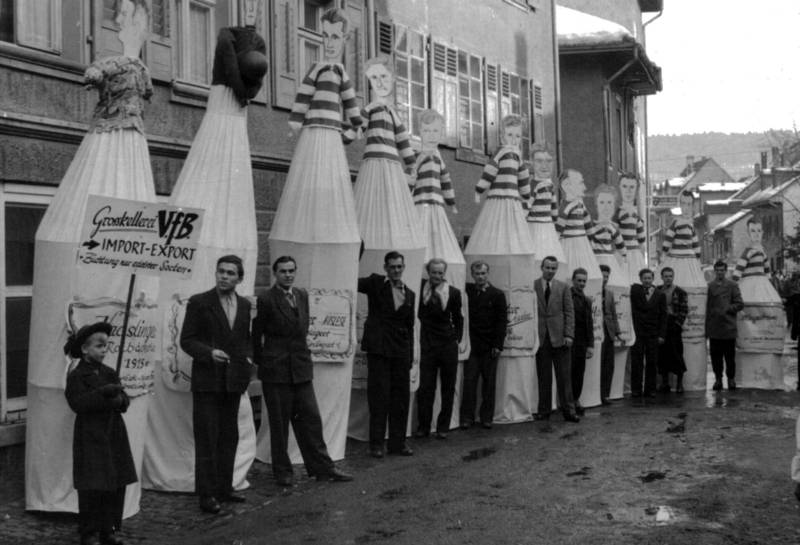 Spricht man über die Waldshuter Straßenfasnacht, so verbindet man dies heute nahezu ausschliesslich mit dem Geschehen rund um den närrischen Flohmarkt. Bis in die fünfziger Jahre wurden auch in Waldshut Straßenumzüge veranstaltet, ehe dann das närrische Treiben auf den Straßen für einige Zeit nahezu fast völlig zum Erliegen kam. Auch der VfB hatte sich mit närrischen Einfällen daran beteiligt und dabei auch durchaus sich selbst 'auf die Schippe' genommen.