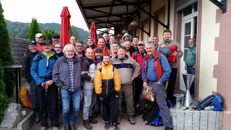 Wir probieren es von links nach rechts: Jürgen Künze, Martin Stoll, Axel Knobloch, Martin Weinkötz, Martin Ruppelt, Marco Marquart, Norbert Bachmann (Kapuze), Thor Klaas, Michael Rotzinger, Ralf Wegmann. Mittlere Reihe: Werner Tröndle, Ludwig Weinkötz, Frank Berthold, Allen Softic, Ulrich Rotzinger, Joachim Stoll, Achim Fischer. Vorne: Michael Kohler, Petrit Merdita, Hubert Widmann, Frank Bauer, AH-Boss Michael Münch und Reiseleiter Stefan Rimmele. Rechts in grün der freundliche Wirt.